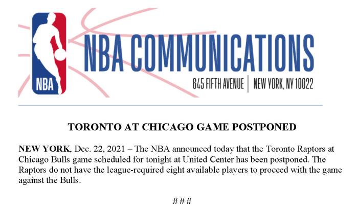 NBA还宣布延期猛龙与公牛的比赛,原因是无法凑够8名球员上场