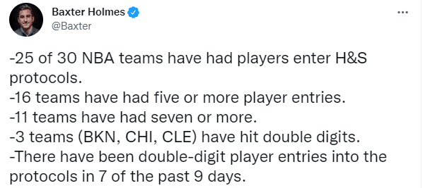 据ESPN记者Baxter Holmes报道,目前全联盟30支球队已经有25支球队有球员触发健康与安全协议,其中16支球队至少有5名球员触发防疫协议,11支球队至少有7人被隔离,3支球队被隔离人数达到两位数(篮网等队);在过去的9年,有7天触发防疫协议的人数是两位数。