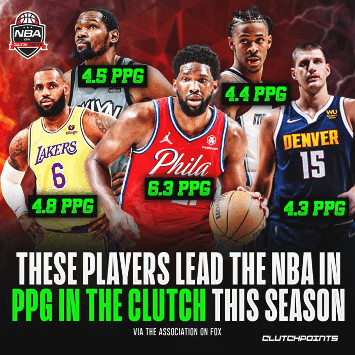 360直播12月23日讯,据美媒ClutchPoints统计,本赛季至今关键时刻场均得分排名前五榜单上,恩比德场均6.3分领跑联盟,詹姆斯场均4.8分力压杜兰特排名第二。