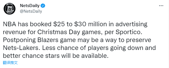 360直播12月23日讯,据美媒NetsDaily的报道,本赛季的圣诞大战,NBA至少可以获得2500-3000万美元的广告收入,美媒还表示联盟延期篮网和开拓者的比赛很可能是因为篮网接下来要和湖人打年终大战,这样的话明星球员上场的机会更大。