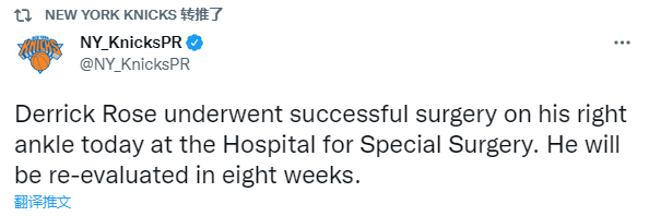 360直播12月23日讯,尼克斯折损一员大将,据名记shams报道,尼克斯球星德里克-罗斯成功接受右脚踝手术,至少伤停8周,之后尼克斯官宣,罗斯预计伤停两个月。