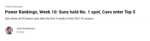 360直播12月21日讯 ,NBA官方更新了球队的实力榜。在NBA官方最新一期的实力榜上,太阳继续排名第一,勇士位居第二。篮网仍排在第五,但近来状态火热的骑士已经超过他们,升至实力榜第四。湖人的排名和上周一样,仍是第15位。