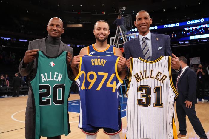 随着本场比赛早早出手两次三分球,库里生涯常规赛三分出手总数正式超越哈登(6918次)成为现役三分出手第一人,也成为历史第二人;目前历史三分出手数最多的球员是雷阿伦(7429次),本赛季库里场均至少出手13次三分,预计将在明年超越雷阿伦,从而独占历史三分出手榜首。
