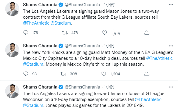 湖人用双向合同签下梅森-琼斯,曾为火箭效力并且哈登一起打过比赛;在发展联盟南湾湖人,出战12场比赛,场均轰下17.8分6.5篮板7.1助攻1.1抢断,三分命中率41.2%。