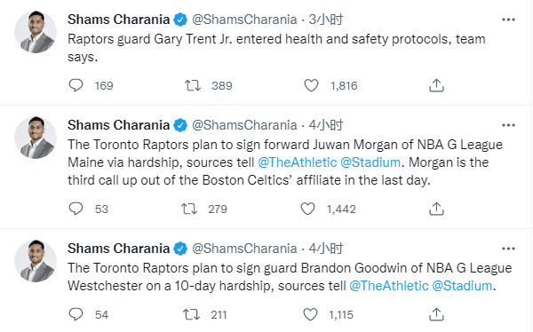 猛龙用困难特例和布兰登-古德温签下10天合同;又用困难特例签下前锋朱万-摩根和尼克-斯陶斯卡斯。