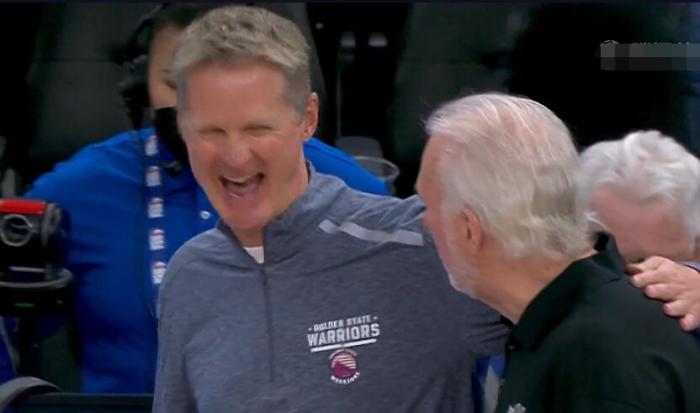 勇士最后一节凭借库里的三分命中,一度反超。但怀特关键三分和造犯规,再度让马刺超出。库里随后重新回到打铁模式,勇士形势不利。随着最后时刻普尔的三分不中,勇士也彻底放弃了比赛。此时,勇士主帅科尔和马刺主帅波波维奇,不约而同走到技术台,两人亲切交流。科尔搂住波波维奇的博主,而老帅则在向科尔说着什么,科尔听完之后,哈哈大笑。师徒两人的关系真的很好,今年夏天,他们还一起率领美国男篮奥运夺冠。