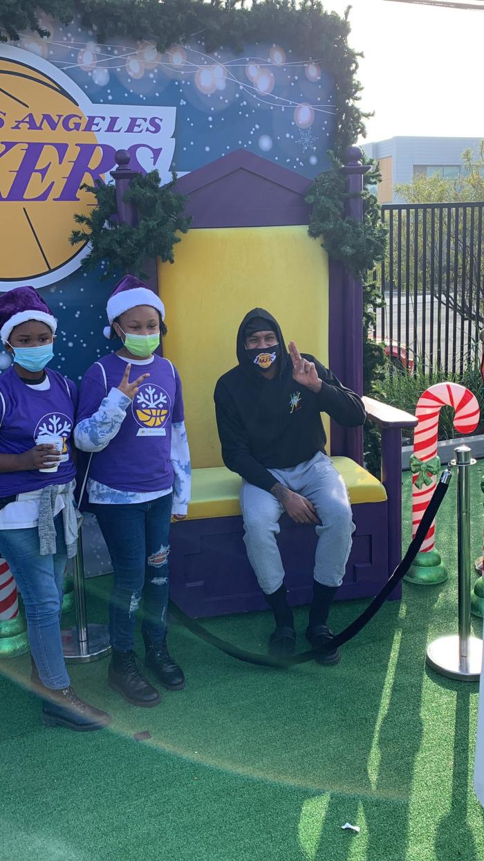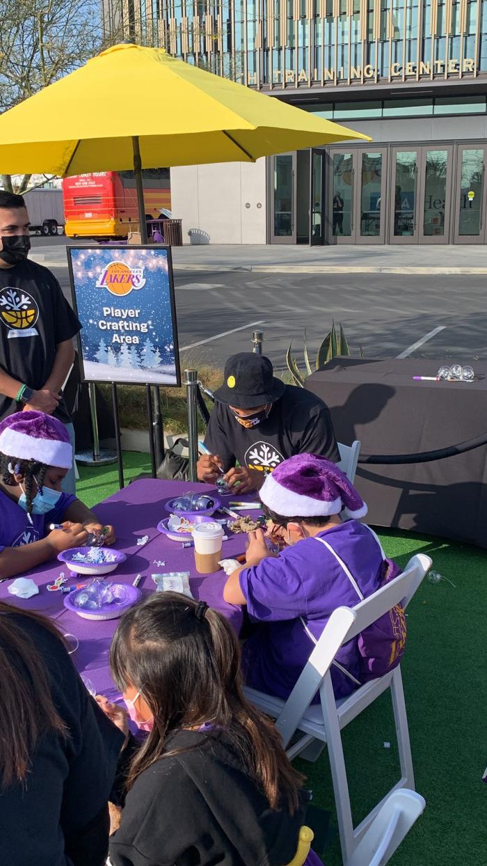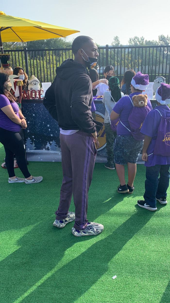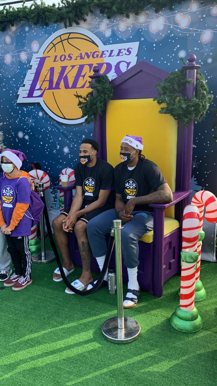 浓眉带着湖人配色的圣诞帽,应该是在给小球迷们派发东西,他的面前站满了人,还有一些大人用手机录视频;贝兹莫尔和小球迷们一起做东西,当地阳光明媚,很多人穿着短袖。