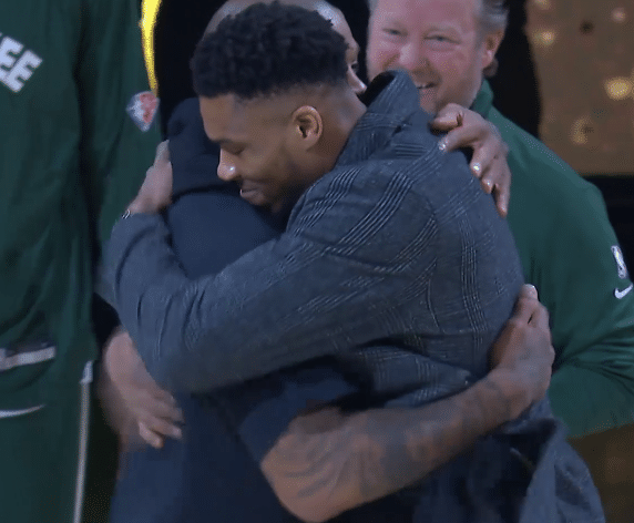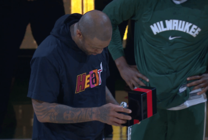 360直播12月05日讯 ,在热火和雄鹿赛前,PJ-塔克正式领取属于自己的总冠军戒指,字母哥紧紧拥抱前队友,塔克认真打量这一枚总冠军戒指,满脸洋溢着幸福的笑容,雄鹿主场还为塔克播放致敬视频。