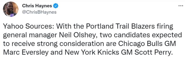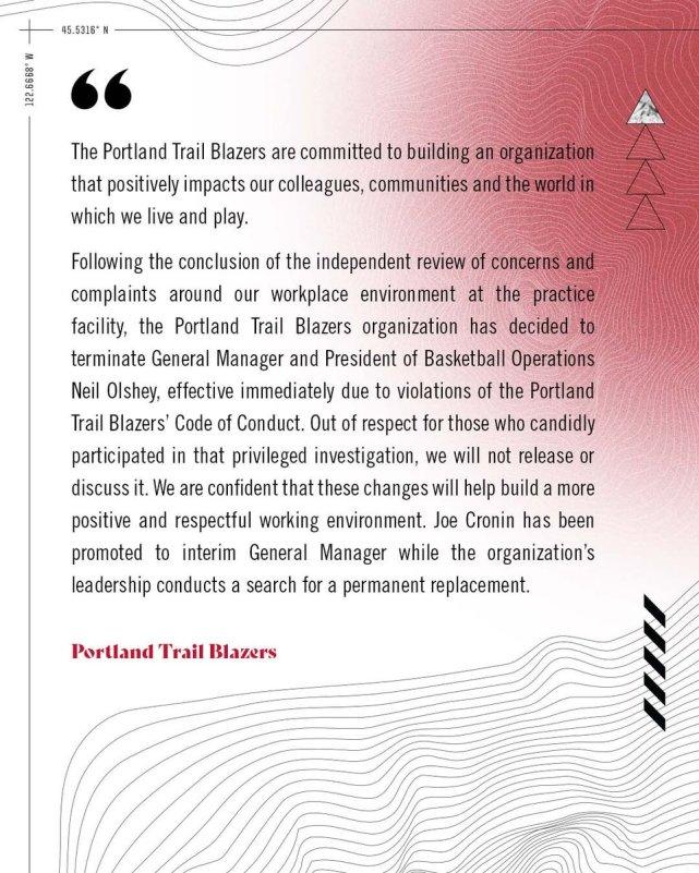 360直播讯 北京时间12月4日,开拓者官方发表声明,正式解雇总经理兼篮球运营总裁尼尔-奥尔希。官方声明中表示,奥尔希被解雇的原因是“违反球队行为准则”。人事主管乔-克罗宁升任临时总经理,名记Chris Haynes报道称,公牛总经理马克-埃弗斯利和尼克斯总经理斯科特-佩里是开拓者聘用新总经理的两大目标人选。