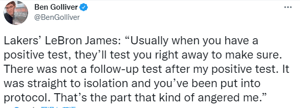 360直播12月04日讯 ,湖人惜败快船赛后,詹姆斯回应误诊新冠,直言困惑、沮丧和生气;詹姆斯透露联盟对这件事的处理方式让他很愤怒,本该再次检测却直接隔离,还透露误诊新冠后一些其他细节。