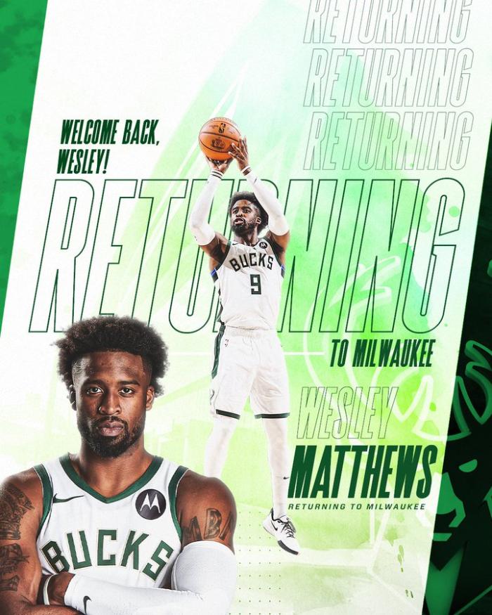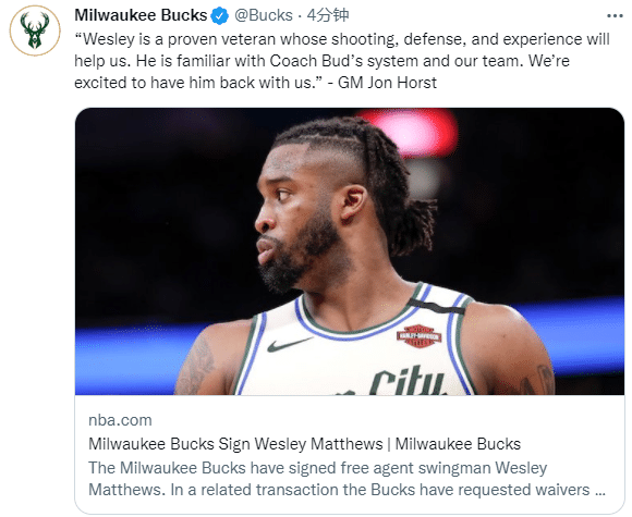 360直播12月04日讯 ,密尔沃基雄鹿正式宣布签约韦斯利-马修斯,晒出马修斯昔日集锦,发推写道:欢迎回家,马修斯!雄鹿官方还宣布马修斯将改穿23号球衣,他将再次联手字母哥冲击总冠军。