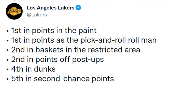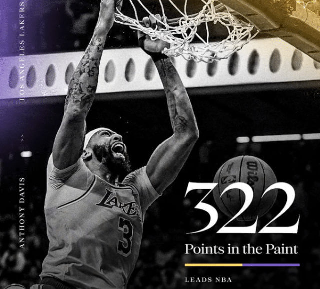 随后,湖人官方还晒出了浓眉其他排名靠前的内线数据:禁区得分和挡拆后得分排名联盟第一,限制区进球和背身单打得分排名联盟第二,扣篮数排名联盟第四,二次进攻得分排名联盟第五。