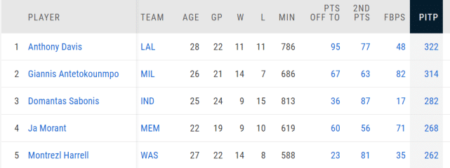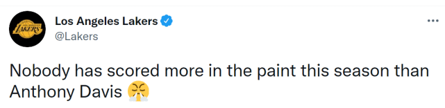或许是为了预热这场比赛,湖人官方晒出了浓眉的一项出色数据。赛季至今,浓眉内线总得分达到322分,排名联盟第一。湖人官方还配文写道:“本赛季,没人在内线得分比安东尼-戴维斯更多。”数据显示,内线得分排在第二至五位的依次是字母哥(314分)、小萨博尼斯(282分)、莫兰特(268分)和哈雷尔(262分)。