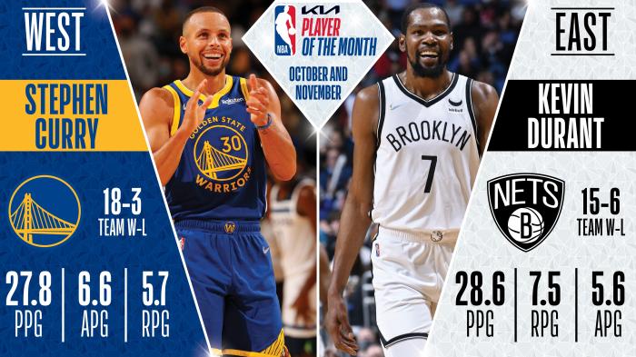 360直播12月03日讯 ,NBA正式宣布常规赛10月和11月东西部月最佳球员,杜兰特和库里分别当选,两人获奖并且都创纪录。