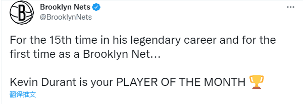 篮网官方第一时间恭喜杜兰特当选东部月最佳球员。