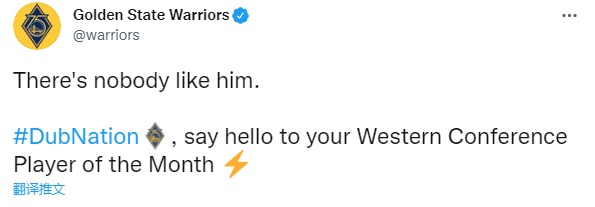 勇士官方第一时间恭喜库里,发推写道:没有人能像他一样,向西部月最佳问好。