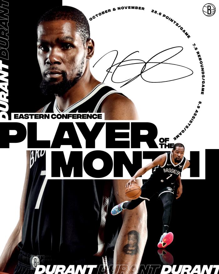 杜兰特篮网生涯首次夺得月最佳,也是他的生涯第15次获得月最佳;杜兰特成为哈登、文斯-卡特、肯扬-马丁和基德之后篮网队史第五位获得月最佳的球员。