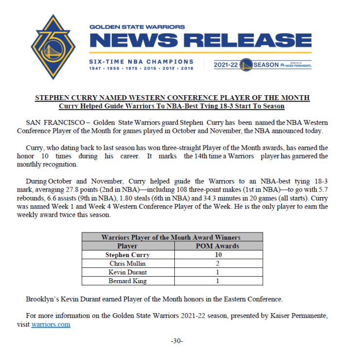 这是库里职业生涯第10次获得西部月最佳,继续刷新队史第一纪录;勇士队史总共只有4人累计14次获得月最佳,库里一人10次,另外三人分别是克里斯-穆林2次,杜兰特和伯纳德-金各获得一次。