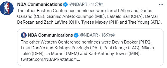 西部月最佳获提名球员:太阳布克、独行侠东契奇和波尔津吉斯、快船队乔治、掘金约基奇、灰熊莫兰特和森林狼唐斯