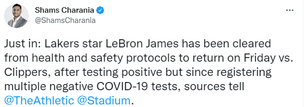360直播12月03日讯 ,据名记shams报道,詹姆斯已经解除隔离,可以出战下一场与快船的比赛,他最新的多次检查结果呈阴性。