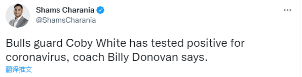 360直播12月02日讯 ,NBA又有一人确诊新冠,据名记Shams报道,公牛主帅比利-多诺万表示,球队后卫科比-怀特新冠检测结果呈阳性,确诊新冠被隔离,无法随队前往纽约。