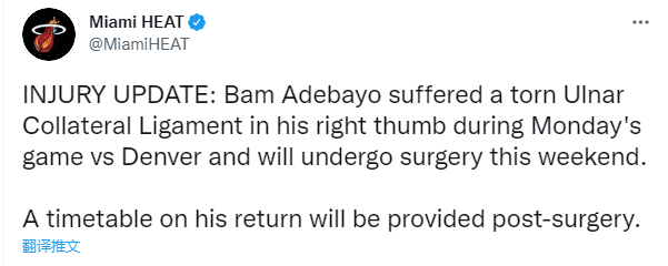 据ESPN名记沃纳罗斯基报道,阿德巴约将因伤缺席4-6周,暂时没有具体的复出时间表,该伤病平均缺席26场比赛。