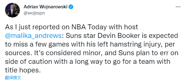 据沃纳罗斯基报道布克将因腿筋伤势缺席接下来的几场比赛,太阳方面认为布克的伤势并不严重,但球队对其伤势持谨慎态度,避免对争冠希望造成影响。