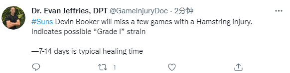 上一场太阳对阵勇士,布克在第二节受伤离场,因腿筋伤势提前退赛;医学专家Evan Jeffries认为布克可能遭遇腿筋一级拉伤,预计将缺席7-14天;本赛季,布克场均上场32.2分钟,得到23.2分4.9篮板4.5助攻0.9抢断,他的受伤是对太阳的一大打击。