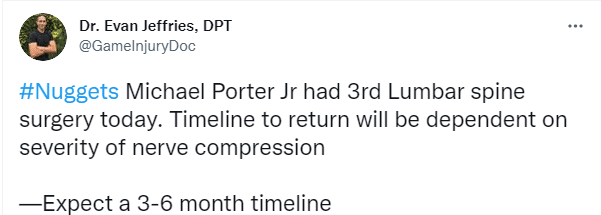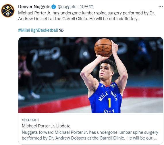 掘金正式宣布小迈克尔-波特接受腰椎手术,他将无限期缺阵;Evan Jeffries表示,今天小波特进行了第三次腰椎手术。返回的时间表将取决于神经压迫的严重程度,预计伤停3-6个月。