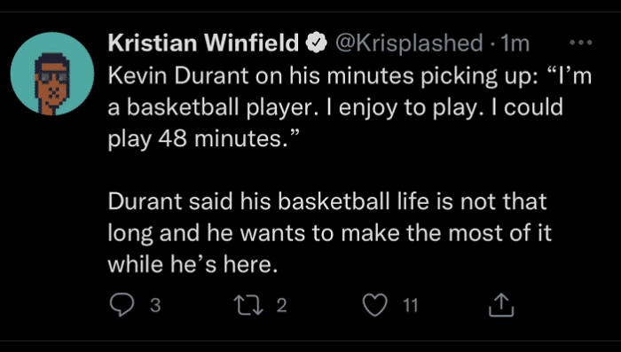 杜兰特接受采访,他谈到了自己此役出战40分钟30秒,表示自己是一个球员,喜欢打球,也可以打48分钟。杜兰特称他的篮球生涯没有剩太多年了,想趁在场的时候尽可能多打一些时间。