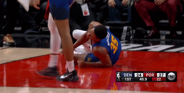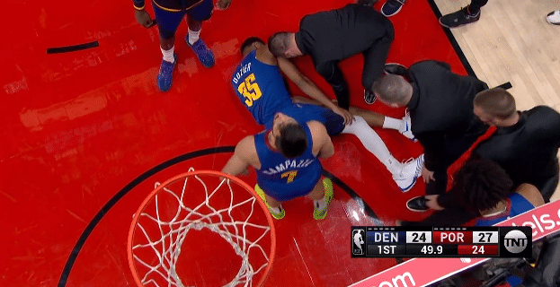 第一节49.9秒,掘金球员多齐尔冲入内线并且迎着防守上篮,落地时左膝严重扭伤,之后多齐尔捂着膝盖,表情十分痛苦,掘金队医迅速冲上球场查看他的伤势,随后多齐尔直接被两人抬出球场去接受治疗;受伤下场前,多齐尔替补上场4分钟,3投1中拿到2分2篮板1助攻。