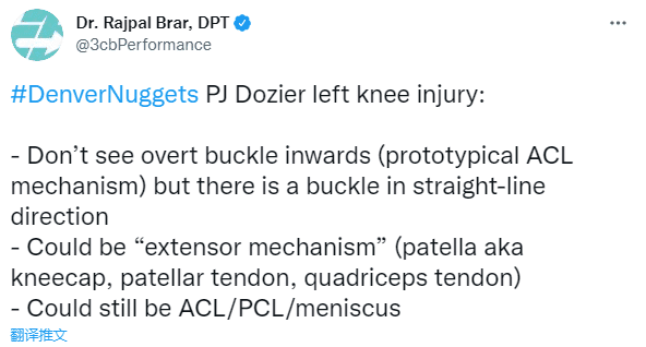 医学专家Rajpal Brar分析多齐尔受伤,没有看到明显的向内扭伤,但有一个弯曲,可能是过度伸展,也可能遭遇十字韧带、半月板等重伤。
