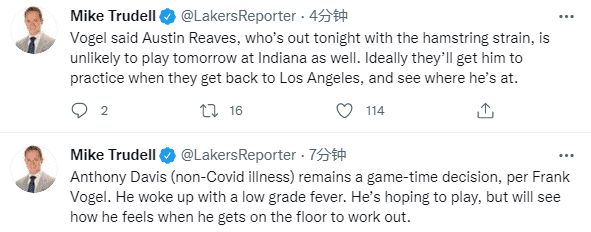 沃格尔还透露奥斯汀-里夫斯的伤情,他表示里夫斯因腿筋拉伤缺席今天的比赛,明天也不太可能在印第安纳打球。理想情况下,当他们回到洛杉矶时,球队会让训练,然后看看他的感觉如何。