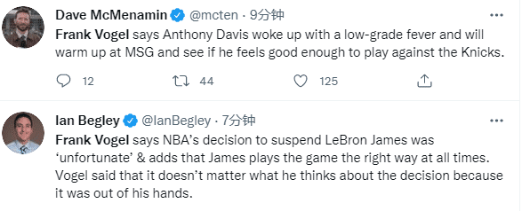 湖人主教练弗兰克-沃格尔表示,安东尼戴-维斯醒来时出现低烧的情况,并且一整天都在发烧。他会在赛前上场热身,看看自己走动的感觉如何。沃帅还表示浓眉本人想要出战,要等到赛前才能决定他的出战状态。