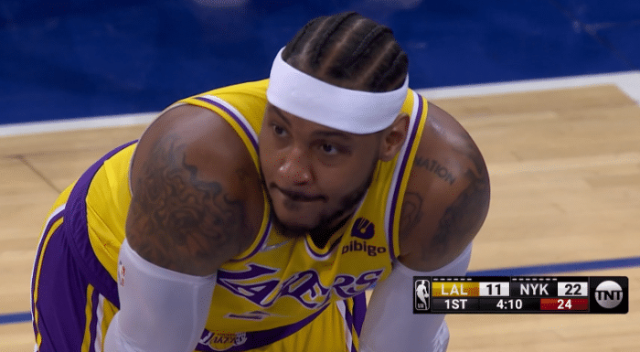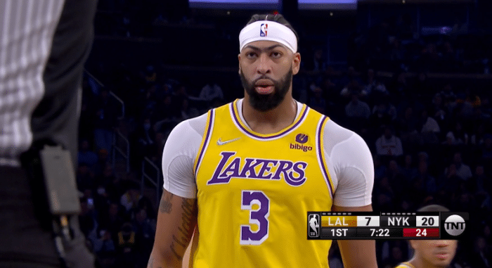 360直播11月24日讯 ,詹姆斯因禁赛一场而缺席,浓眉带病坚持出战,第一节上场8分钟4投1中拿到2分,湖人首节20-36落后16分被压制,安东尼重返纽约点燃现场;湖人旧将兰德尔单节10分6篮板,富尼耶11分。