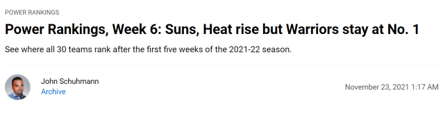 360直播11月23日讯 ,继ESPN之后,NBA官方也更新了球队的实力榜。在NBA官方最新一期的实力榜上,勇士仍然排名第一,太阳升至第二。篮网排名第四,而湖人排名已跌至第19位。