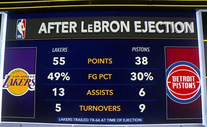 本场比赛发生火爆的冲突事件,詹姆斯击打斯图尔特的面部,活塞悍将暴怒引冲突,现场混乱不堪,斯图尔特就像爆炸的火药桶似的,最终两人都被驱逐离场;冲突之后,湖人全队都想为詹姆斯而赢球。