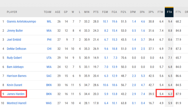 可以看到,在今天击败骑士过后,哈登本赛季场均罚球次数已经来到6.2次,升到了联盟第9的位置。而在本赛季初,哈登的场均罚球一度排在联盟50名开外。除此之外,哈登本赛季场均得分也终于突破了20大关,来到20.2分。