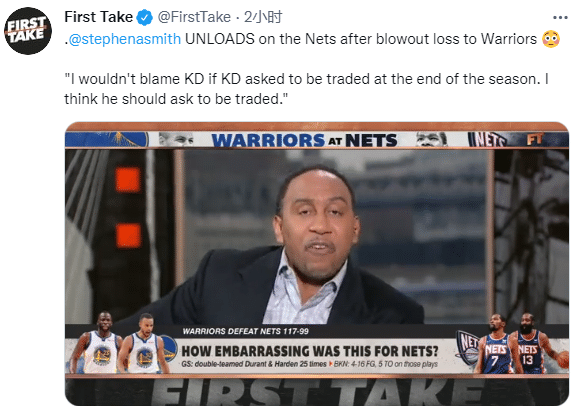 在First Take节目中,谈到篮网惨败勇士,A-史密斯公开责怪欧文,他表示:凯文-杜兰特,我为你感到难过,兄弟。你没有得到任何帮助,最重要的是,你去布鲁克林做出了错误的决定。凯里-欧文已经背叛了你。