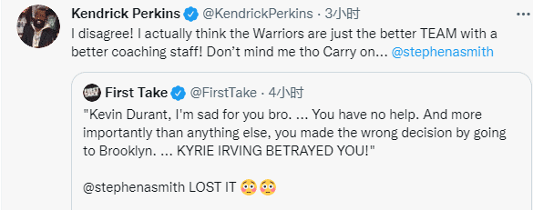 对此帕金斯回应:我不同意!实际上我认为勇士队只是拥有更好的教练组的更好球队。
