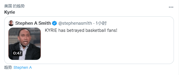 美国杨毅还表示:如果杜兰特在赛季末要求被交易,我不会责怪KD。我认为他应该要求被交易;史密斯更是发推写道:欧文等同于背叛,欧文已经背叛了篮球迷。