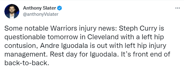 360直播讯 北京时间11月18日,勇士公布下一场对阵骑士的伤病报告,库里因臀部受伤出战成疑(50%出战可能性),伊戈达拉因臀伤确定休战;对于库里的伤情,勇士跟队记者Anthony Slater表示库里是左臀部挫伤。赛季至今,33岁库里已经为勇士打了14场比赛,场均上场33.5分钟能够轰下28.6分6.3篮板6.6助攻以及1.7次抢断和0.7盖帽,场均投进5.4记三分球;库里个人表现炸裂,并且带领勇士拿到12胜2负的骄人战绩,这都是库里冲击生涯第三座MVP的筹码。