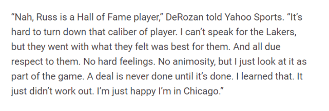 现在,越来越多球迷和媒体认为湖人选错了,德罗赞比威少更适合球队。德罗赞本人显然不想挑起这样的矛盾,他说:“不,拉斯(威少)是名人堂球员,很难拒绝这样水准的球员。我不能代表湖人,但他们选择了他们认为最适合他们的球员。我对他们充满敬意,没有敌意,我只是把这看作是比赛的一部分。一笔交易在正式完成前,永远不能被认为是已经完成。我学到了这一点,(去湖人)只是没有最终达成,但我很高兴我现在效力芝加哥。”