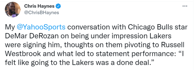 360直播11月17日讯 据德罗赞透露他险些加盟湖人,曾以为交易成定局,但被威少改变。据德罗赞透露,他在休赛期和詹姆斯多次进行交流,经纪人古德温也和球队基本谈妥。一笔通过先签后换将德罗赞送往湖人的交易方案,已经摆在面前。