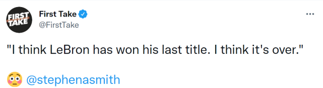 360直播11月17日讯 ,名嘴斯蒂芬-A-史密斯在最新一期的FirstTake节目上发表评论,他认为詹姆斯已经拿到生涯最后一冠,并看好勇士进入本赛季的总决赛。史密斯还强调自己看衰湖人并非因为詹姆斯,而是因为威少。