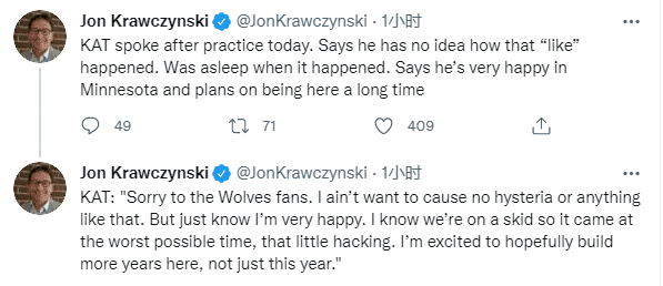 唐斯透露他的推特密码只有三个人知道,但他们都没有点赞“放唐斯自由”的动态;今天训练之后,唐斯公开发声:我完全不知道那个点赞是如何发生的,那个点赞的时间我正在睡觉。我确信账号被盗了,我已经修改了账号密码。我在明尼苏达待得很开心,我也计划在这里继续打很长的时间。