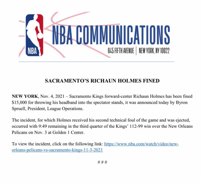 360直播11月05日讯 ,NBA官方又开出一笔罚单,国王首发锋线霍姆斯因朝观众席怒扔发带被联盟罚款1万5千美元;28岁的霍姆斯怒扔发带被驱逐,还被追加罚款。