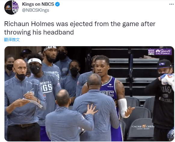 对阵国王,霍姆斯仅仅上场16分钟9投6中拿到16分6篮板1助攻,状态不错却因怒扔发带被驱逐,并且被联盟追加罚款;此前篮网巨星杜兰特曾因失控扔球被联盟罚款2.5万美元。
