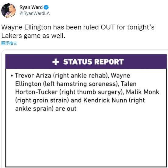360直播10月13日讯 ,湖人对阵勇士的伤情再次更新,除了阿里扎(右脚踝手术)、霍顿-塔克(右手拇指韧带撕裂)、蒙克(腹股沟拉伤)和纳恩(右脚踝扭伤)伤停之外,神射艾灵顿也伤了,因左腿筋酸痛而缺席比赛;三巨头首秀之夜,全队多达5名伤员真是太难了。