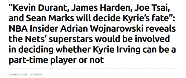 360直播10月12日讯 ,据名记沃纳罗斯基在节目上透露,欧文事件已经迎来关键时刻。篮网老板蔡崇信、篮网总经理马克斯、杜兰特和哈登将一起探讨是否允许欧文以“兼职球员”的身份出战这个赛季。换言之,欧文的命运将由以上四方共同决定。沃纳罗斯基还补充表示,他们决定的不只是欧文短期的未来,还包括长期的未来。